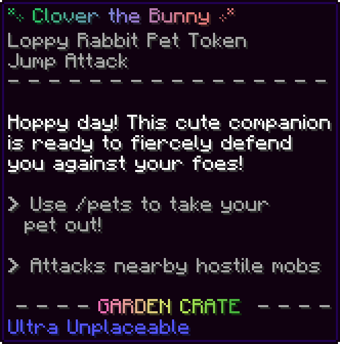 This is the second pet token released on the server, alongside the Garden Crate. By right-clicking while holding this rare, it consumes the token and will give you access to the loppy rabbit pet using the /pets command.