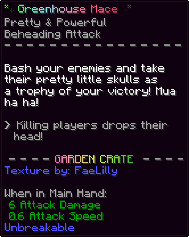 This is the first Unbreakable Mace on Snailcraft, and also the first item to have Beheading Attack. Killing players will drop their head unless they are wearing a Beheading Immunity item.
