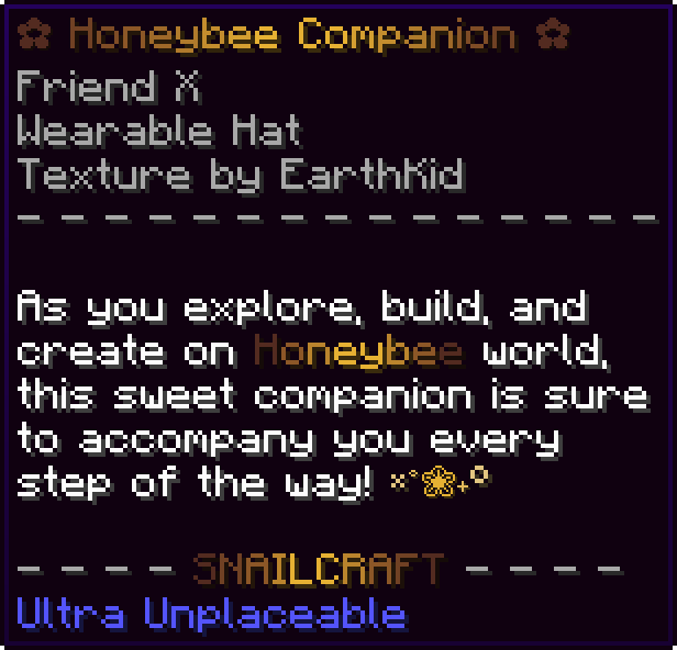 This, along with the Firefly Companion are the first wearable hats released on the server. Themed after the world with the same name, it debuted with the Welcome Crate in January of 2025.