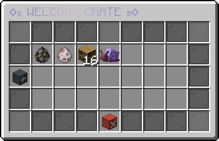 This is the first crate released on Snailcraft January 16th, 2025. This crate leans heavily towards vanilla items, only containing a small handful of rares. This decision was made to give players a helping hand in getting started those first few days of the server being open.